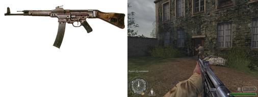Sturmgewehr Maschinenpistole 44 | La MP44, c'est un fusil d'assaut permettant de tirer à longue ou courte portée, sa cadence de tir est modifiable. Il porte l'initiale MP (pistolet mitrailleur) pour ne pas contrarier Hitler qui ne voyait que par les pistolets mitrailleurs. C'est une arme très lourde, cela ce ressent dans le jeu. Ce fusil d'assault (Sturmgewehr) est très efficace si on c'est bien s'en servir, ce qui n'est pas mon cas. Première apparition dans l'armée: 1943