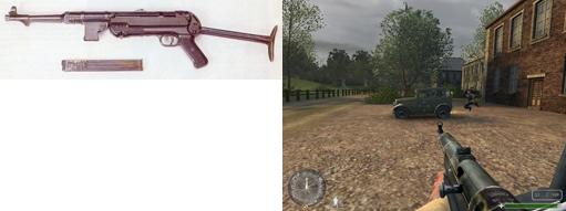 Maschinenpistole 40 | La MP40, pistolet mitrailleur à cadence de tir modérée elle est efficace a courte ou moyenne portée (une centaine de mètre). C'est celle que l'on voit dans tous les films sur la 2nd Guerre Mondiale. Son principal défaut est l'absence de garde au niveau de la poignée, les soldats se brulaient les mains après des tirs continus. Ce défaut n'est bien entendu pas présent dans le jeu. Première apparition dans l'armée: 1940