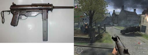 M3 "greasegun" | Mitraillette légère, sa fabriquation et plus simple que celle de la thompson, elle est également plus compacte et plus légère. Elle possère un chargeur de 32 balles, et est quand même légèrement moins puissante que sa grande soeur. Ce sont surtout les hommes des unités blindées qui l'utilisée. Elle fut créée en 1944. |  |